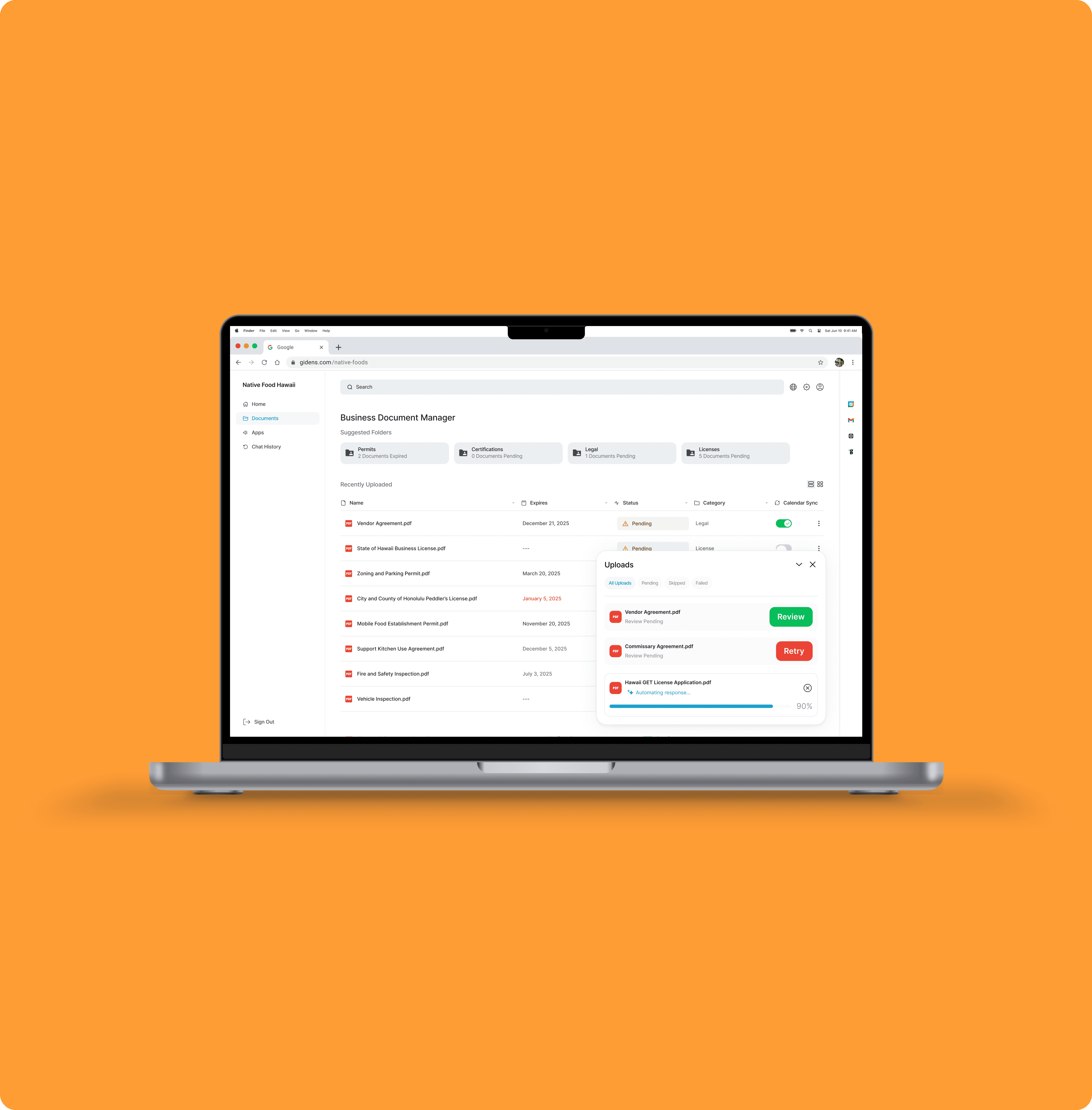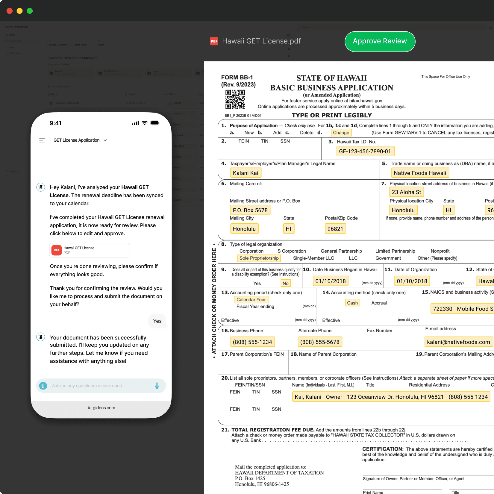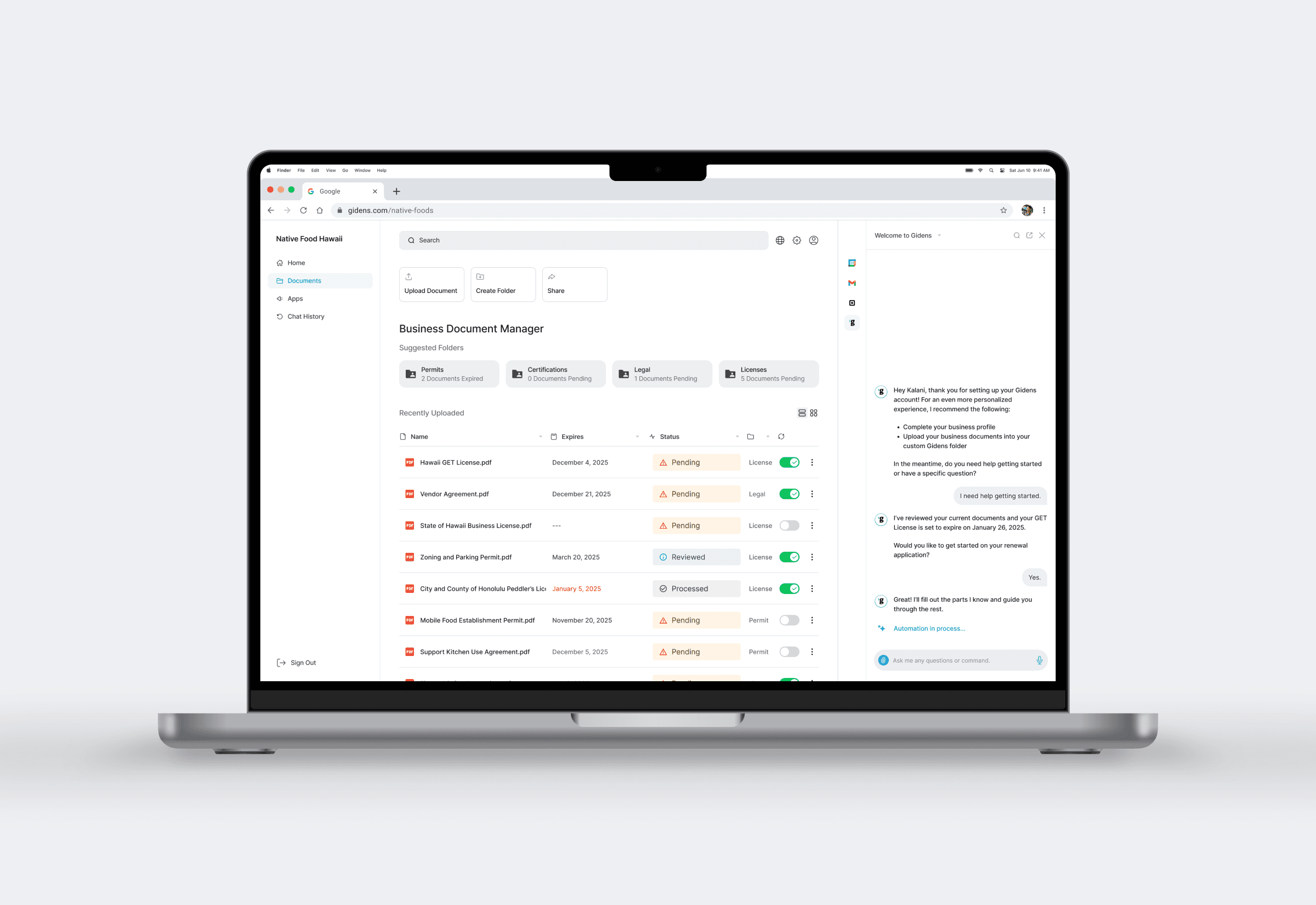 Gidens Compliance Automation feature was designed to remove this administrative burden by leveraging AI to extract to store business information, sync deadlines, auto-fill applications, and track compliance statusโensuring business owners stay ahead without the stress of manual management.