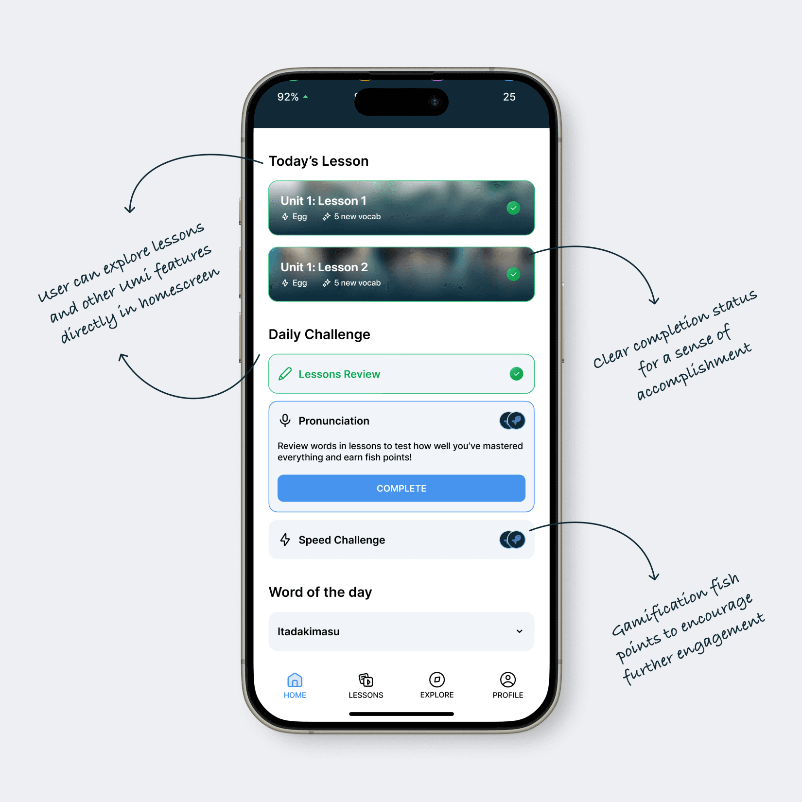 To encourage users to explore features beyond lessons, I redesigned the home screen to focus on daily progress and challenges rather than an infinite scroll of lessons. It presents users only with lessons necessary to achieve their daily targets, along with Daily Challenges (pulled from Umi's Practice options)— integrating gamification elements with fish points as rewards. This approach provides a clear sense of direction and achievement, making engagement with Umi feel more intuitive, structured, and rewarding.