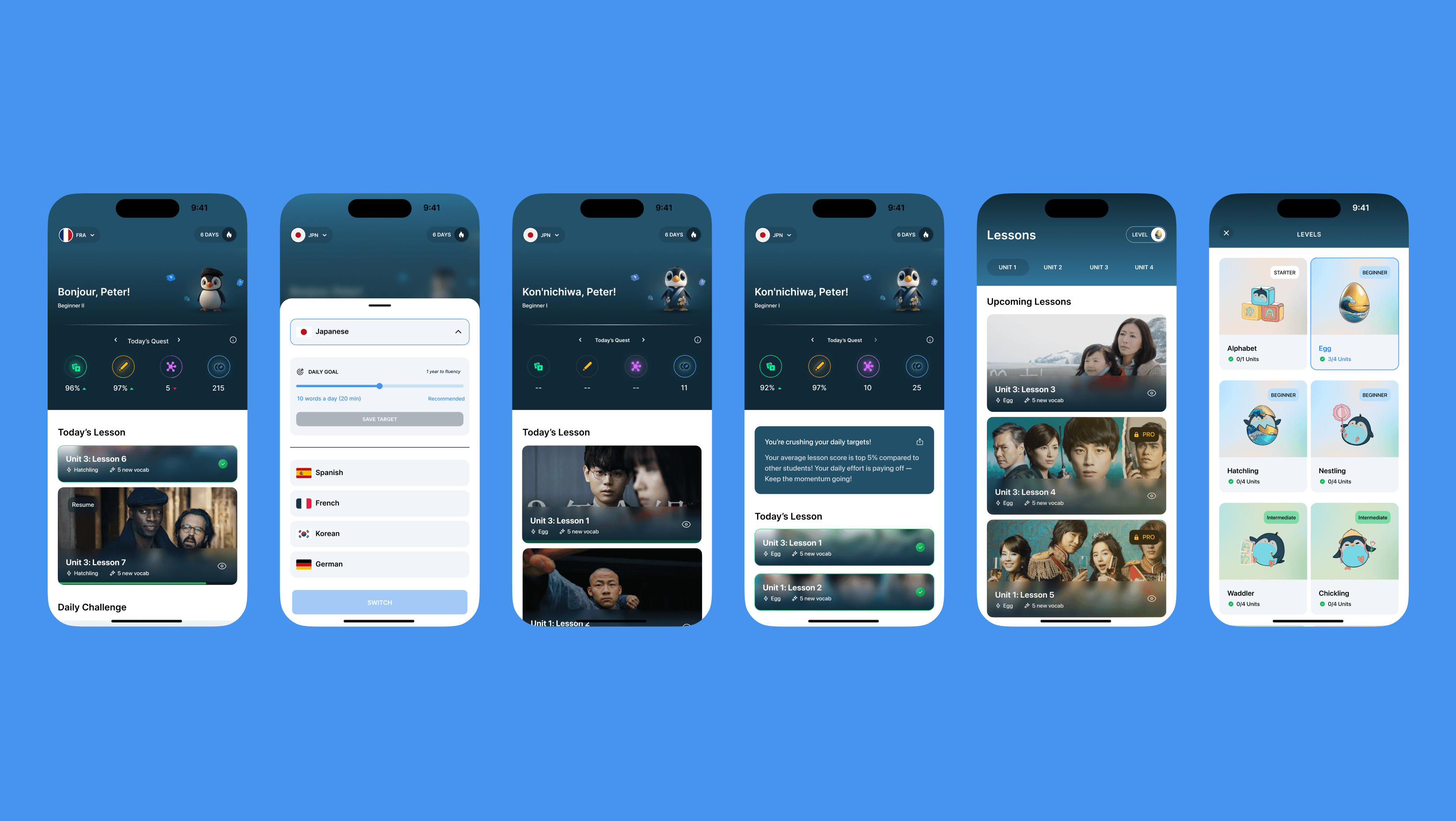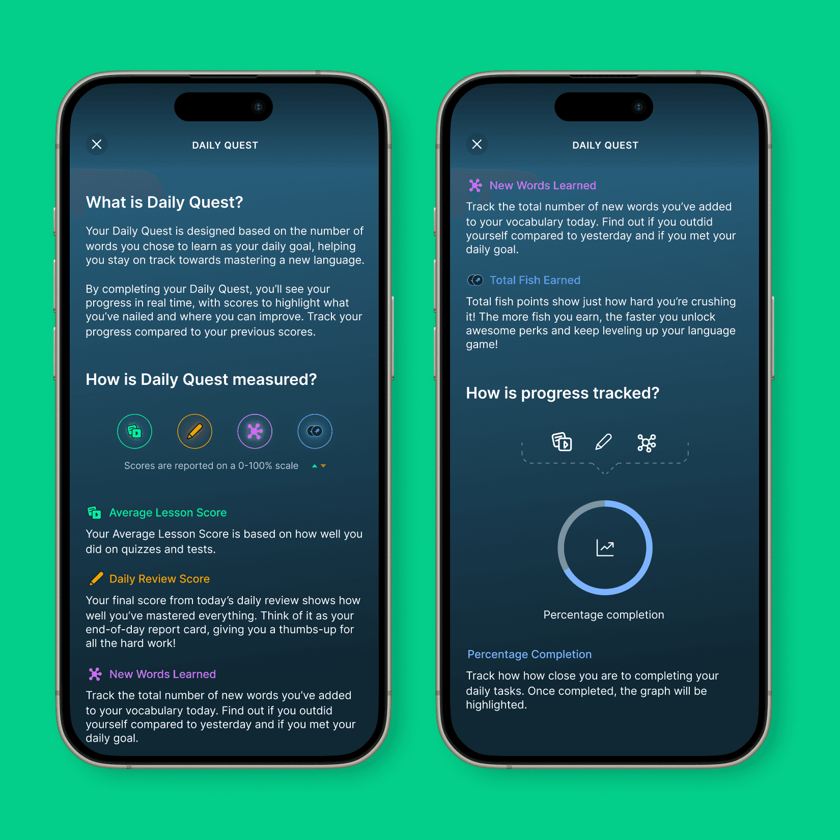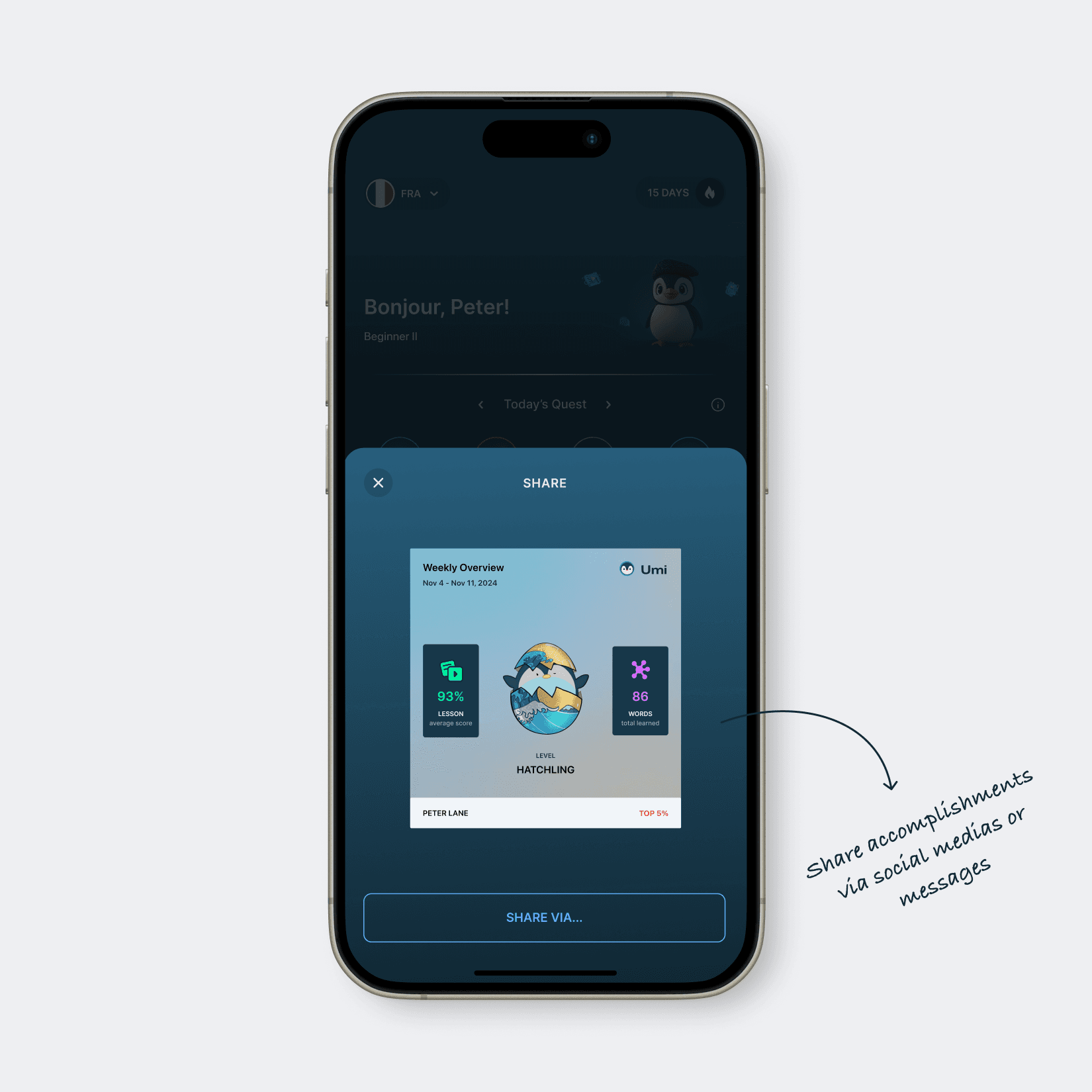 To strengthen users' daily habits and encourage consistent interaction with Umi, I designed a dedicated celebration component that appears each day after users complete their daily quests. A personalized message is shared highlighting their accomplishments, which they can share via social media or messages. Users can also effortlessly track completion of daily quests through clear progress bars, total average lesson scores, new vocabulary learned, and fish points earned—helping them stay motivated and connected to their language goals.