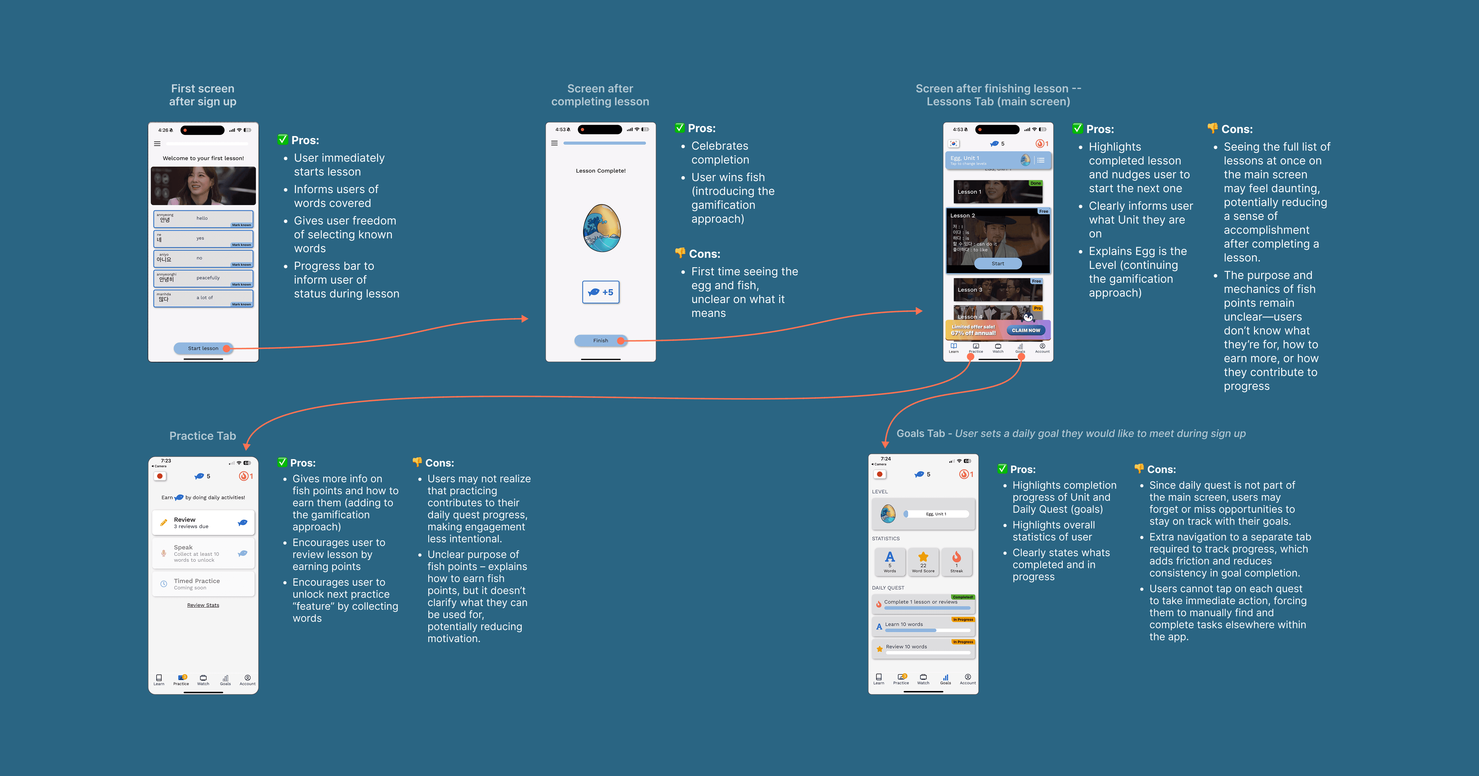 To assess Umi’s user experience, I conducted a UX audit of its core screens, focusing on usability, engagement, and how well the app’s gamified learning approach supports user motivation. By analyzing the Lessons, Practice, and Goals screens, I identified key strengths but also uncovered usability challenges that could impact engagement.