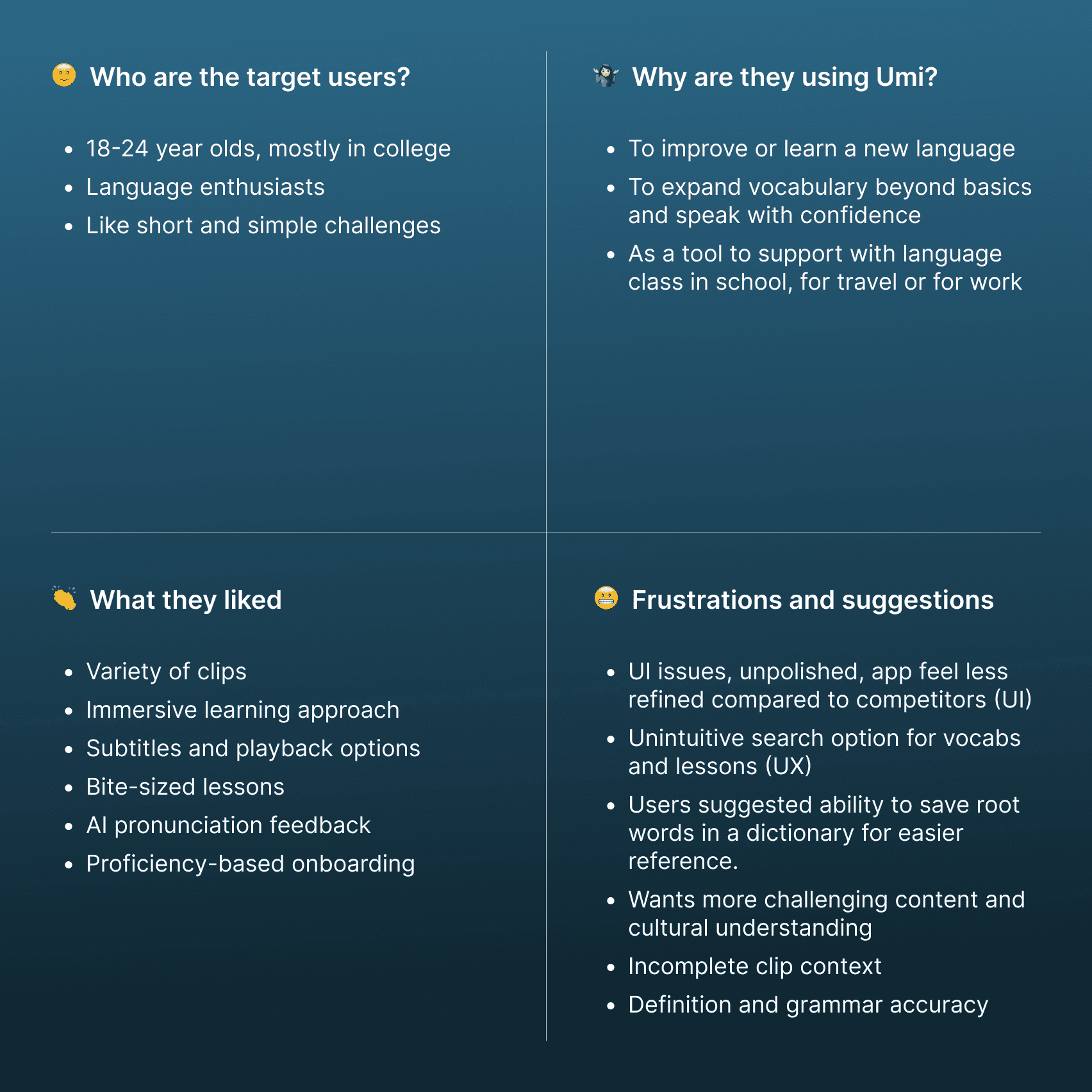 Umi is a gamified language-learning app that teaches words in context using short, real-world video clips from TV shows and movies. While their approach is innovative, there was low engagement beyond lessons and weak daily retention.