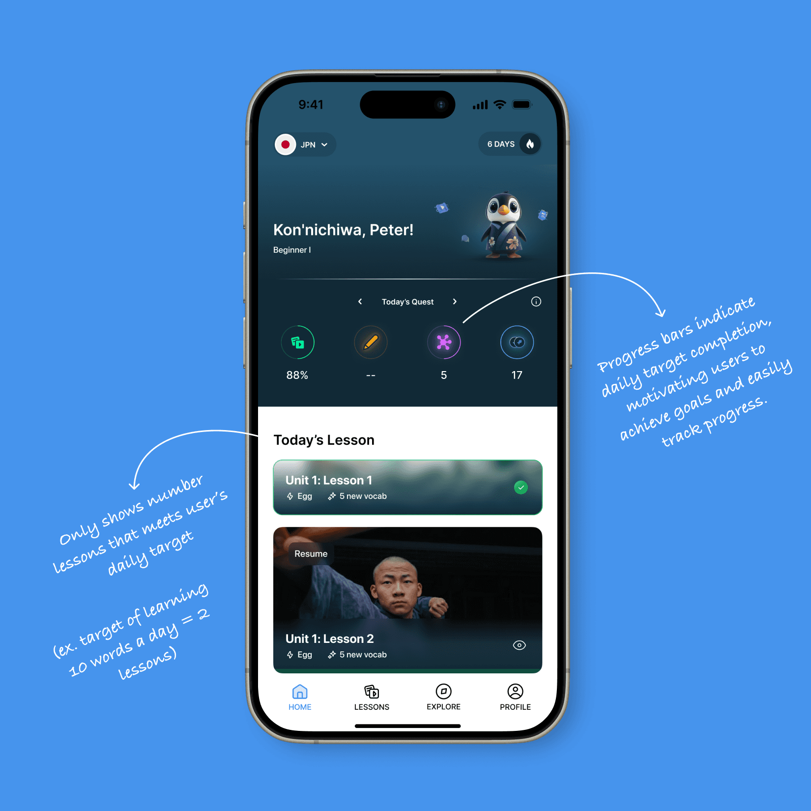 Umi’s previous home screen prioritized lesson access but lacked structured guidance for continued engagement. Research shows the average student feels overloaded when presented with too much information, and gamers seek a clear path to rewards. Cognitive load theory explains that breaking information into small pieces helps people remember it better.